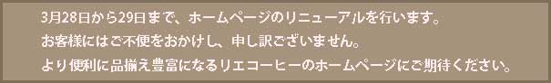 ・3月8日~11日 幕張メッセで開催されるFOODEX JAPAN 2016に「食品業界女性経営者ネットワーク WF-NET」のメンバーとして出展いたしました。 プレスリリースはこちらからご覧いただけます。 ・2016年1月1日(金)QVCにて弊社商品のココアがお買得価格で紹介されました。 ・12月2日(水)AM9:30-AM10:00 QVCにて弊社商品が紹介されました。 ・11月7日(土) PM 12:00-PM 13:00 QVCにて弊社商品が紹介されました。 ・価格改定、内容量変更のお知らせ ・8月22日(土) AM 2:30-AM 3:00 QVCに弊社代表の木原が出演いたしました。 ・8月6日(木)10:30-11:00 QVCに弊社代表の木原が出演いたしました。 ・7月18日(土)5:30と12:30/7月22日(水)12:00~13:00の間の15分にQVCに弊社代表の木原が出演いたしました。 ・6月30日(火)2:30-3:00 QVCに弊社代表の木原が出演いたしました。 ・リエ―コーヒーのカフェでフリーWi-Fiがお使いいただけます。ご来店の際にお使いになりたい方は店舗スタッフまでお申し付けください。 ・お得なギラデリココア2缶セットを販売中です。 ・5月21日(木)21:30-22:00 QVCに弊社代表の木原が出演いたしました。 ・4月15日~17日 東京ビックサイトで開催される「デザート・スイーツ&ドリンク展」に出展いたしました。